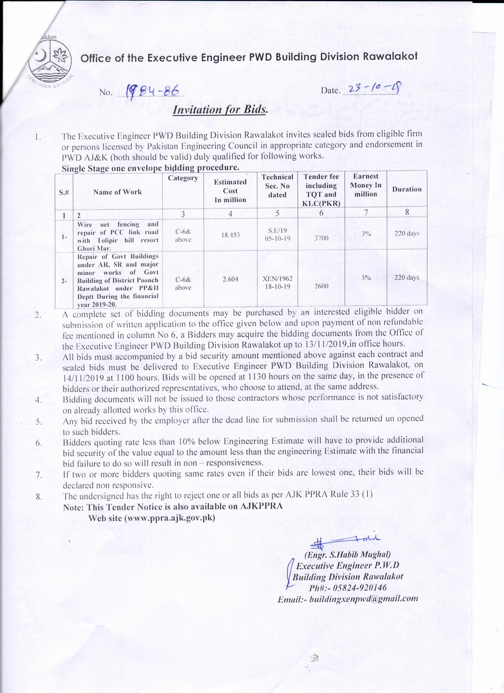 Tender For Works (Building Division Rawalakot) |