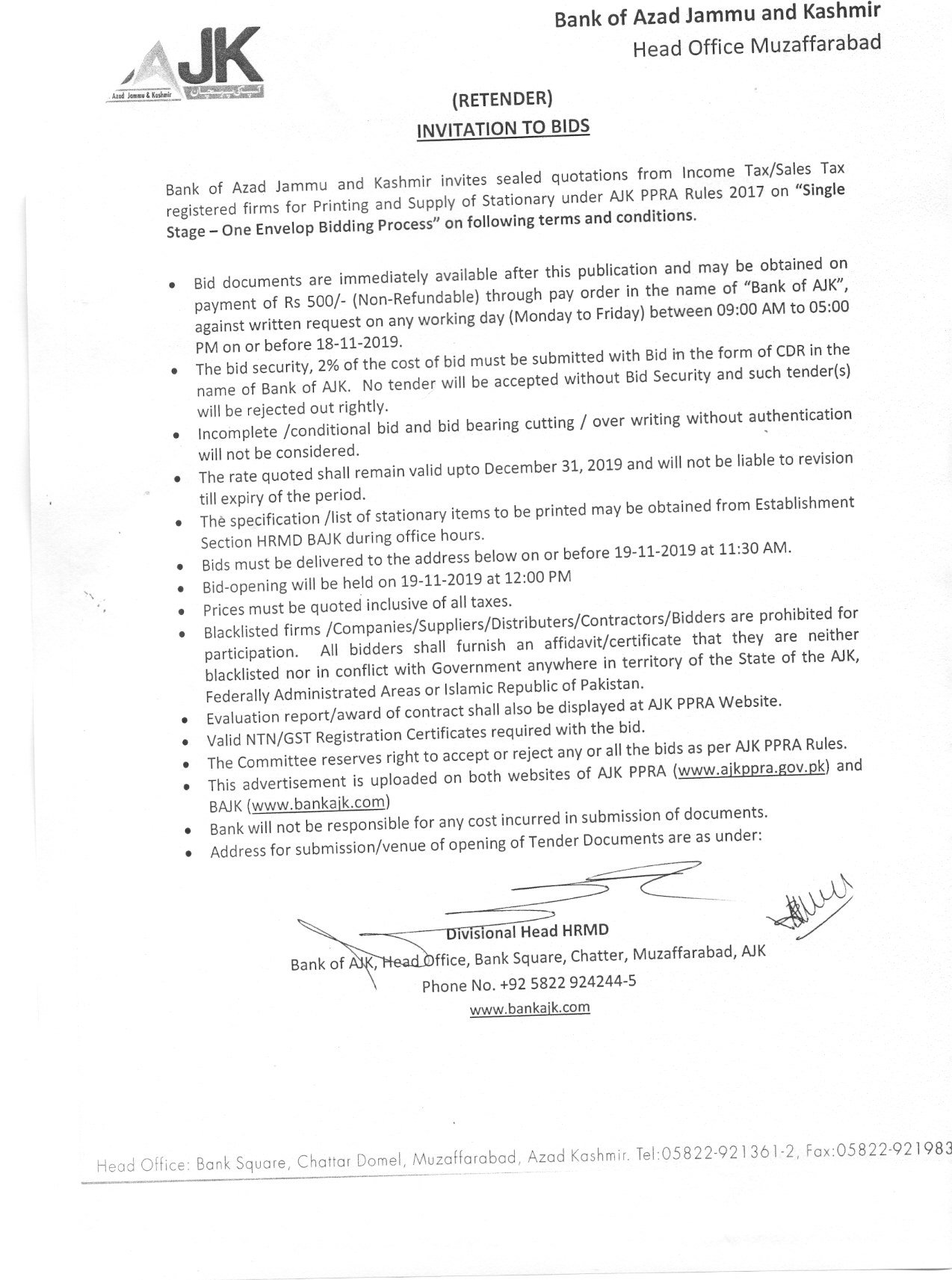 01-11-2019 | 19-11-2019 | Close | AJK BANK | BAJK | Download File
