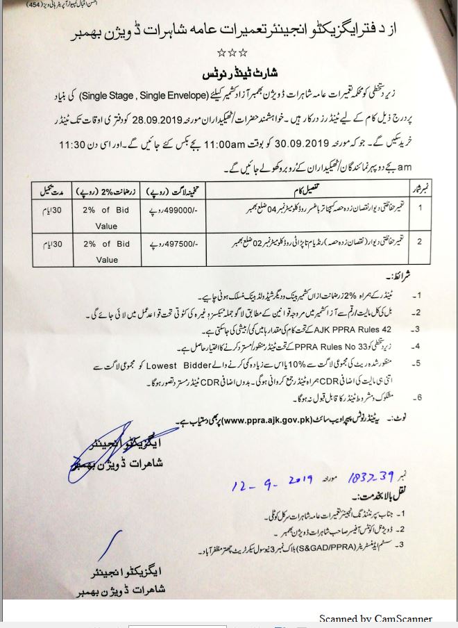 12-09-2019 | 30-09-2019 | Close | C&W | Highways Division Bhimber | Download File |