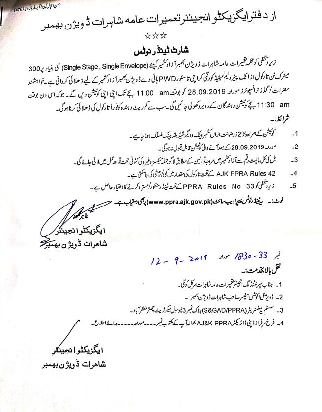 06-09-2019 | 26-09-2019 | Close | C&W | Highways Division Muzaffarabad | Download File |