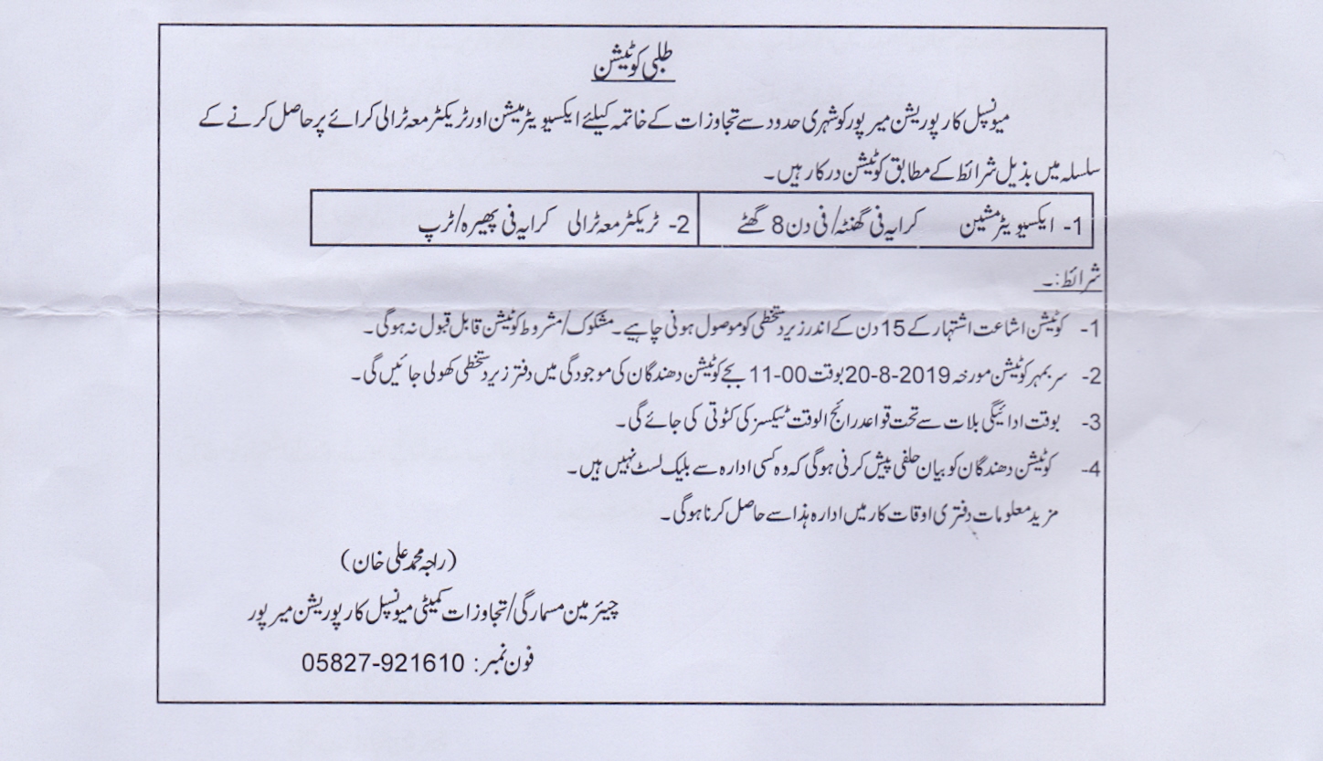 07-08-2019 | 20-08-2019 | Close | Corporations | Municipal Corporation Mirpur | Download File |