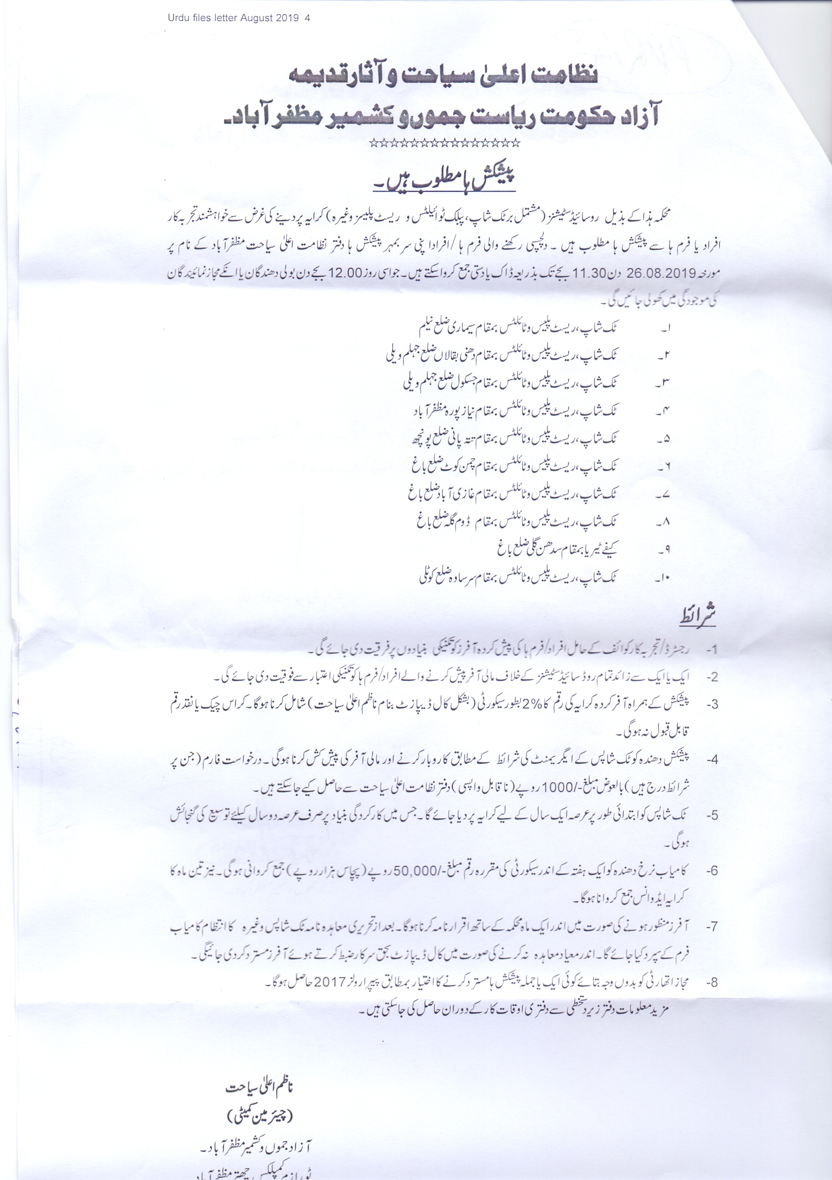 23-08-2019 | 11-09-2019 | Close | Tourism and Archaeology | Tourism and Archaeology Muzaffarabad | Download File