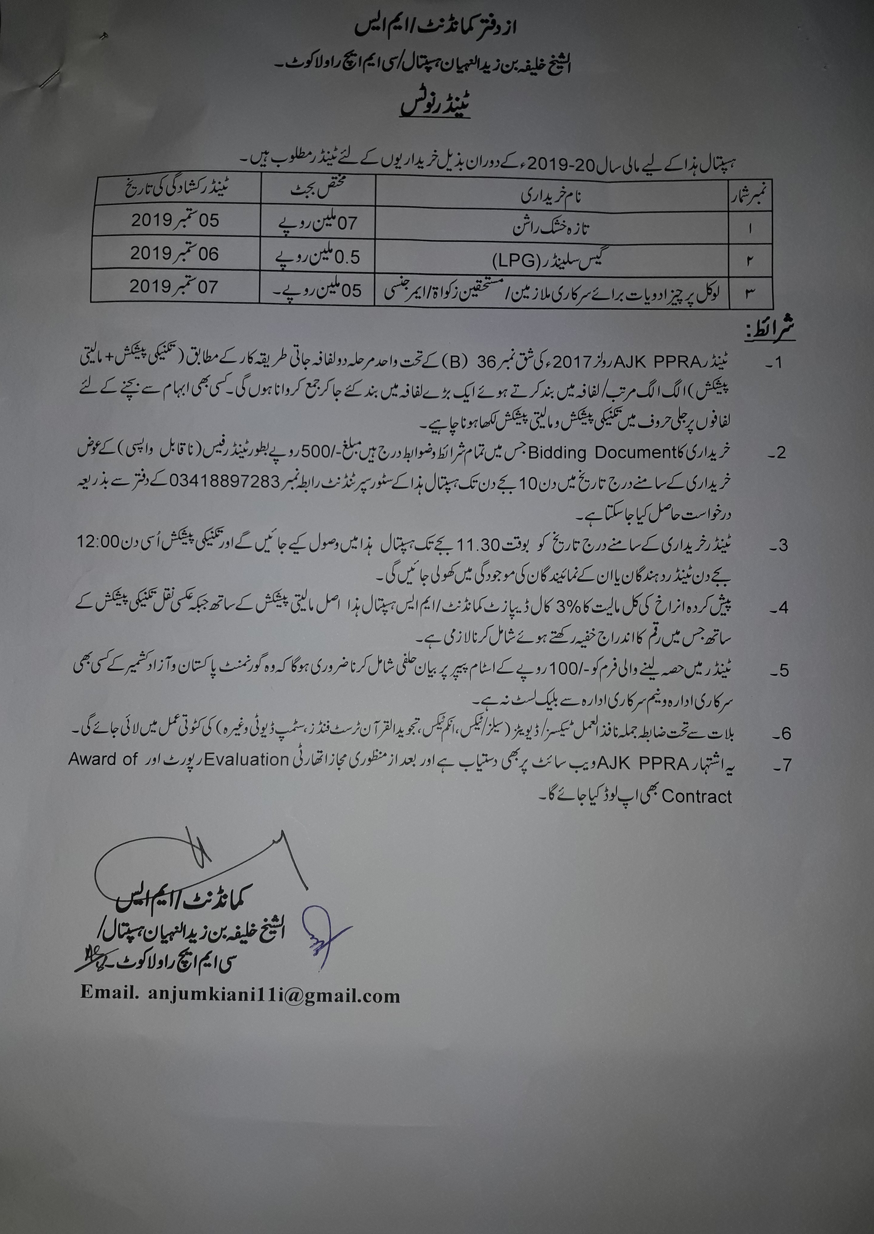 Tender For Goods (CMH Rawalakot) |