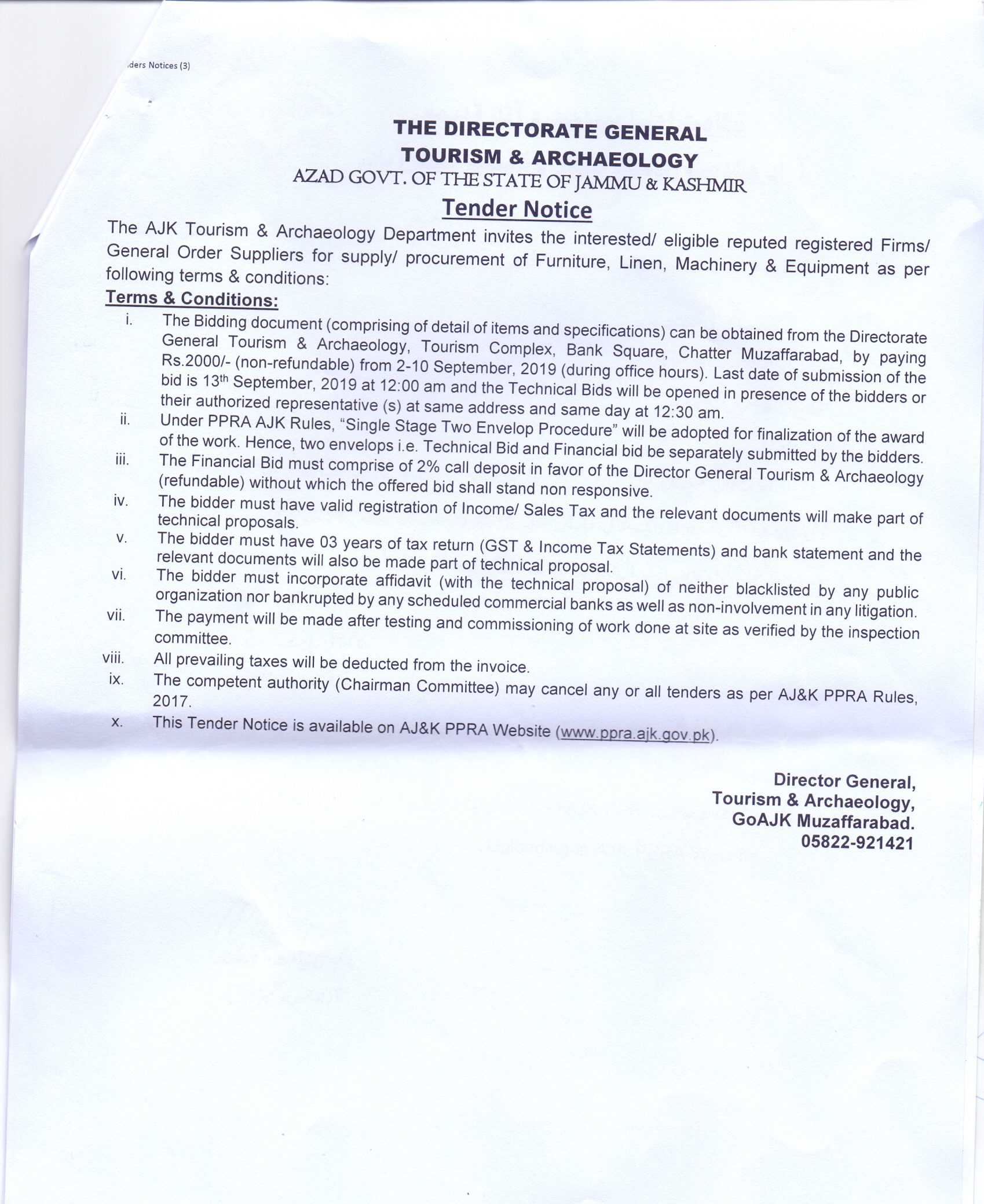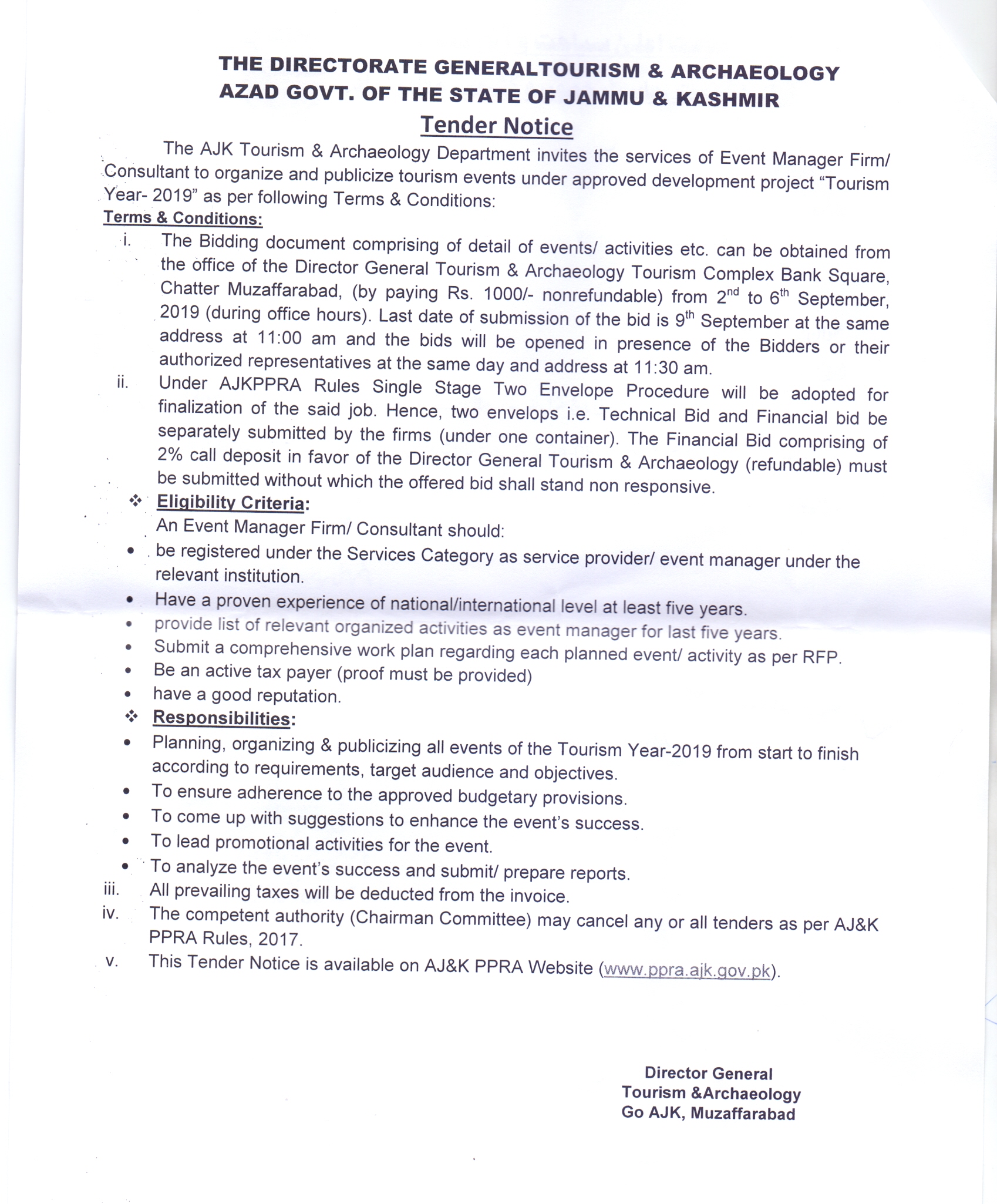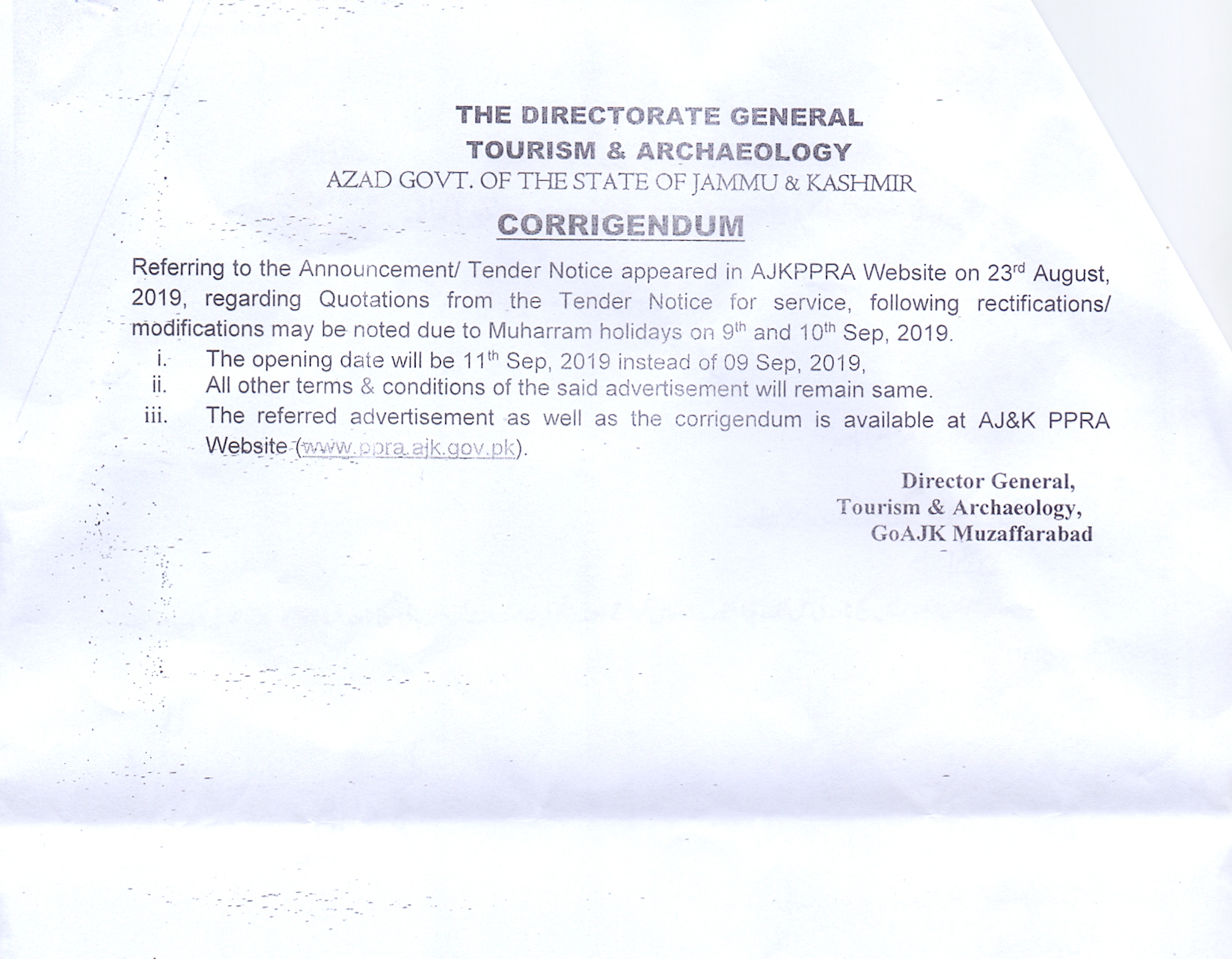 26-08-2019 | 13-09-2019 | Close | Tourism and Archaeology | Tourism and Archaeology Muzaffarabad | Download File |