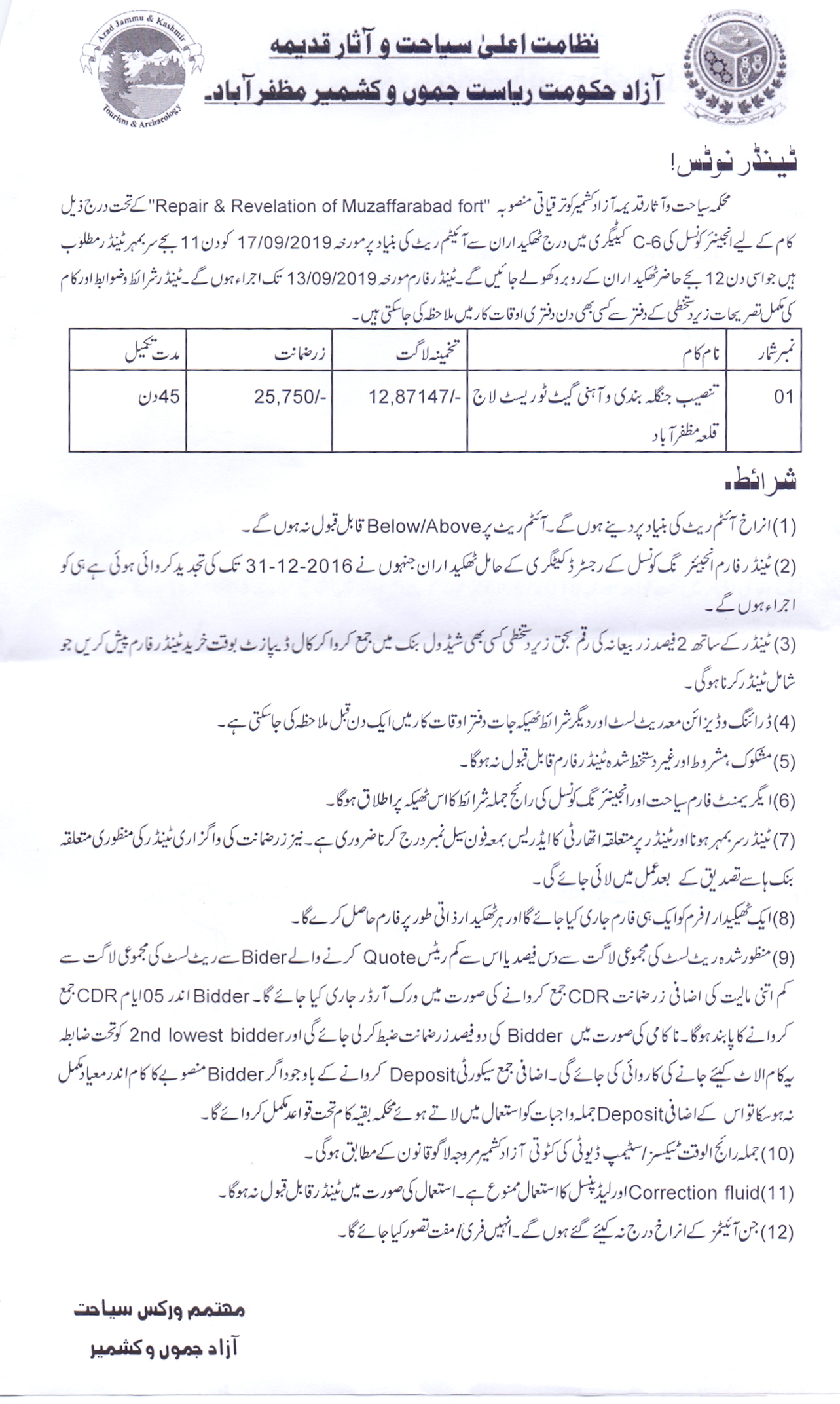 28-08-2019 | 13-09-2019 | Close | Tourism and Archaeology | Tourism and Archaeology Muzaffarabad | Download File |