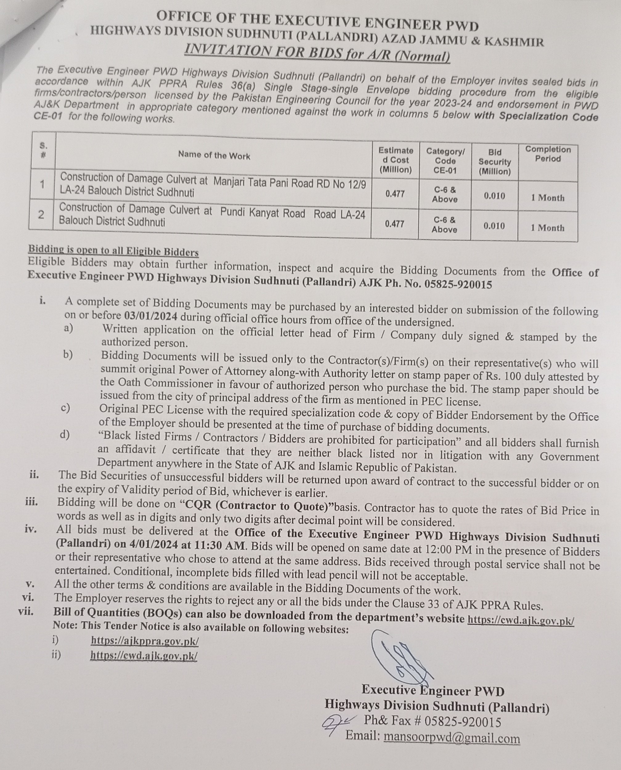 04-01-2024 | 22-01-2024 | Close | C&W | Highways Division Muzaffarabad | Download File