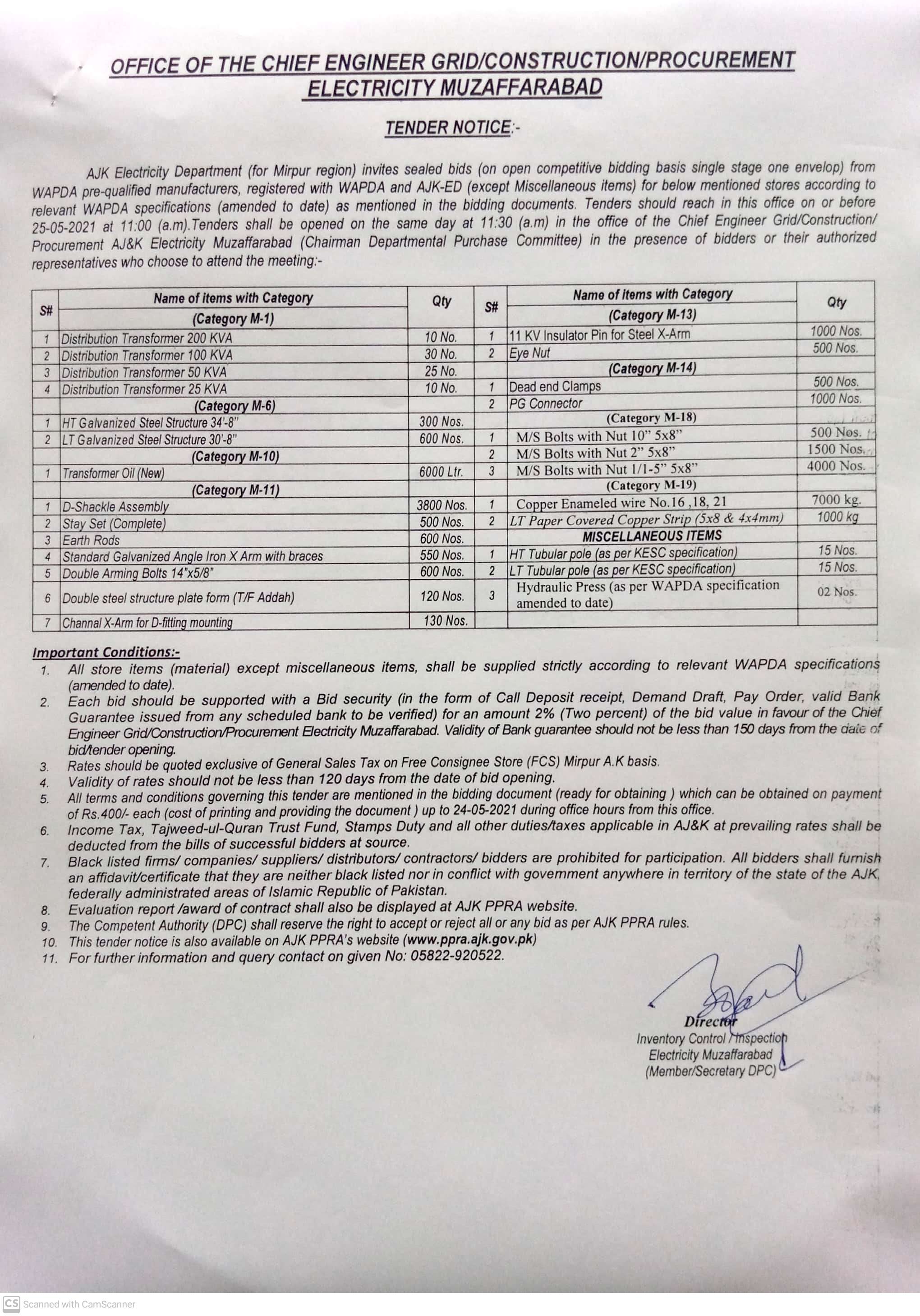 07-05-2021 | 24-05-2021 | Close | Energy and Water Resource | Electricity Muzaffarabad | Download File |