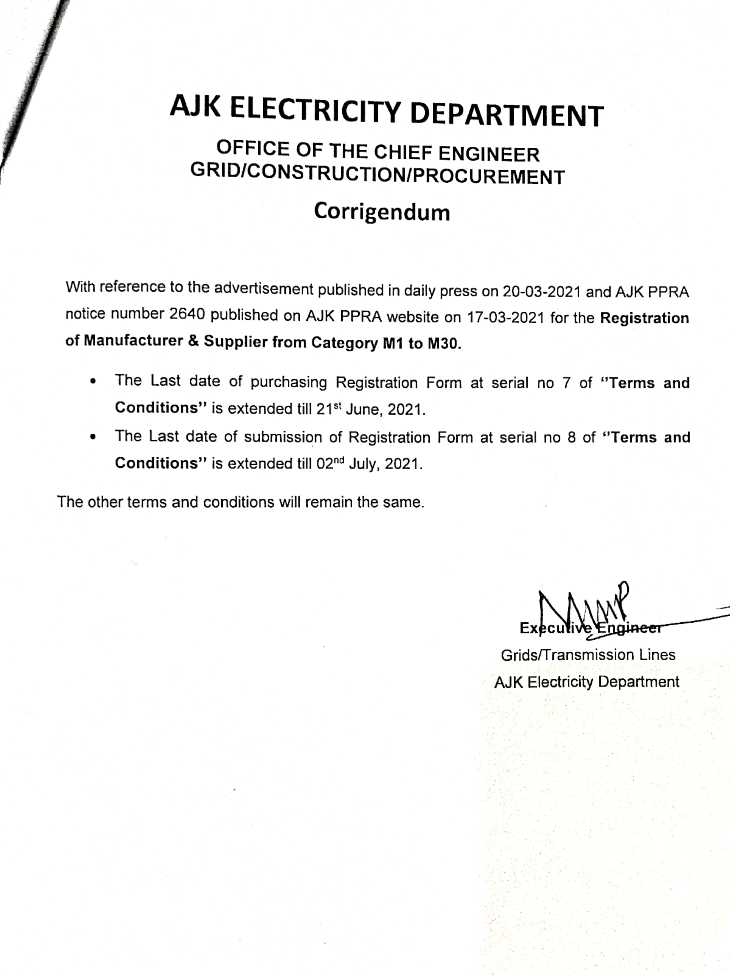 17-03-2021 | 02-07-2021 | Close | Energy and Water Resource | Electricity Muzaffarabad | Download File