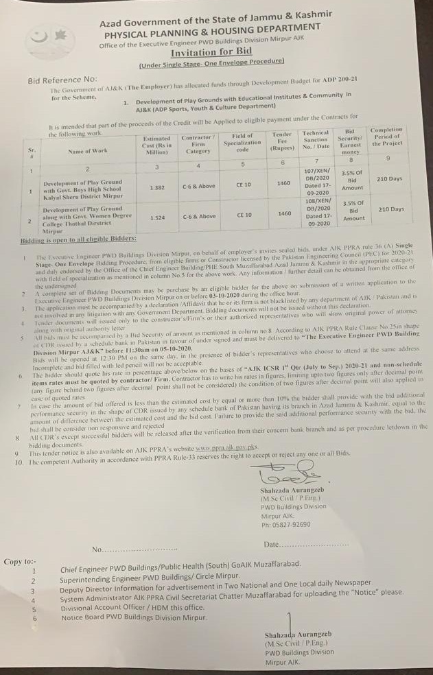 11-09-2020 | 06-10-2020 | Close | C&W | Highways Division Muzaffarabad | Download File