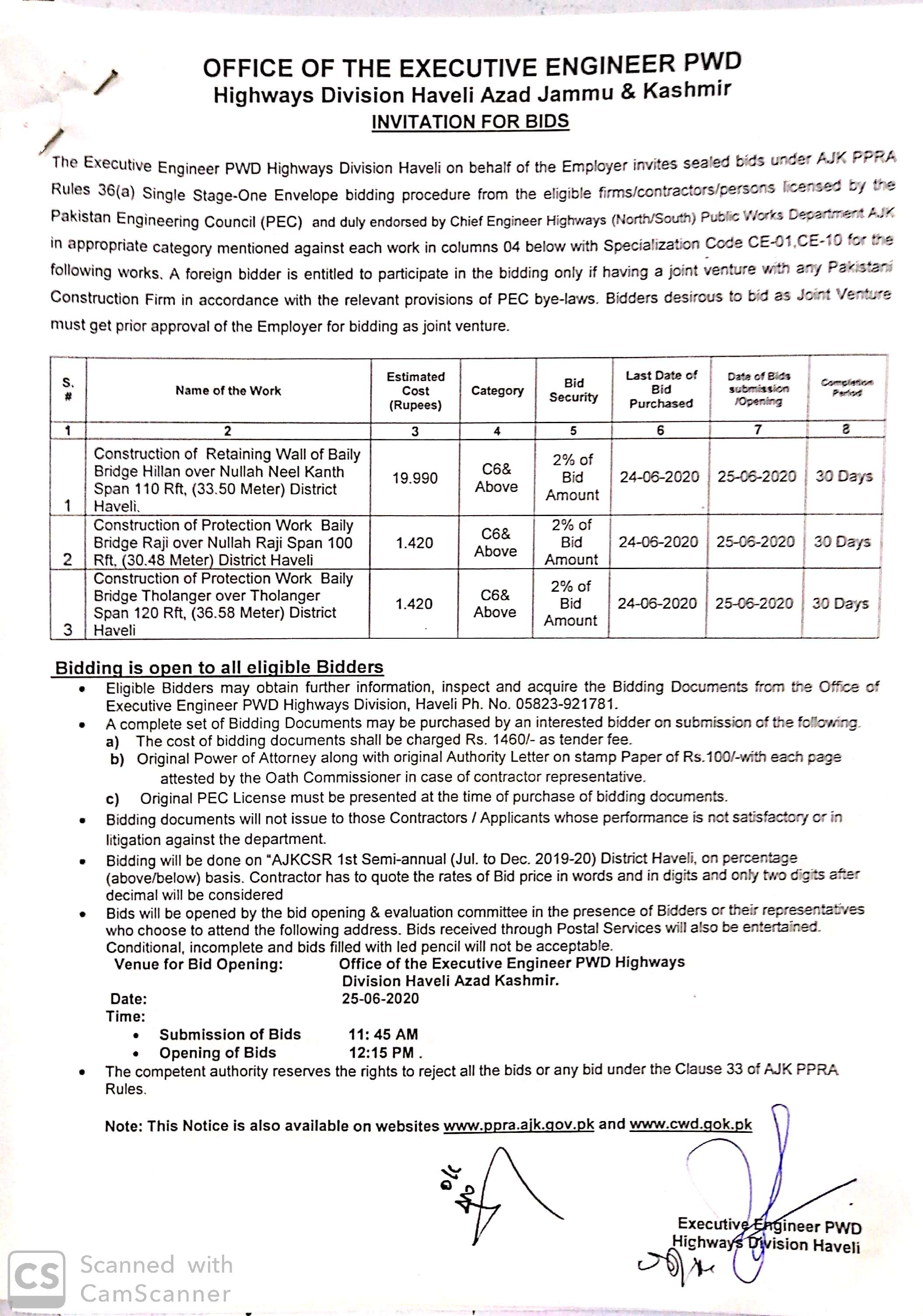 09-06-2020 | 20-06-2020 | Close | C&W | Highways Division Muzaffarabad | Download File |