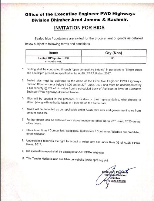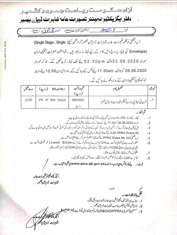 08-06-2020 | 26-06-2020 | Close | C&W | Highways Division Bhimber | Download File |